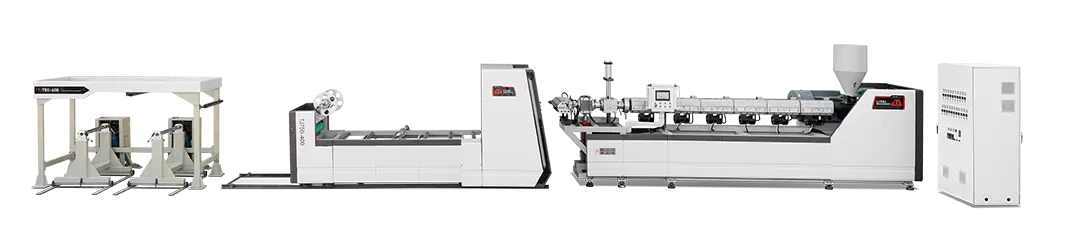 2. Máy đùn: Đây là bộ phận cốt lõi của máy cán màng nhựa, chủ yếu gồm trục vít và hệ thống gia nhiệt. Thông qua tác động quay và cắt của trục vít, nguyên liệu nhựa được nấu chảy, hóa dẻo và đẩy vào cổng đùn. Máy đùn thường sử dụng thiết kế trục vít đơn, trục vít đôi hoặc nhiều trục vít theo các tính chất vật liệu khác nhau để đạt được hiệu quả trộn và đùn tốt nhất.