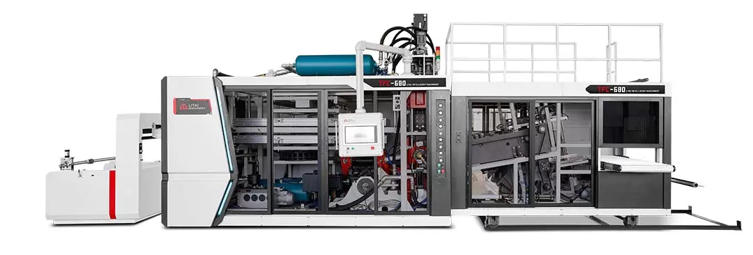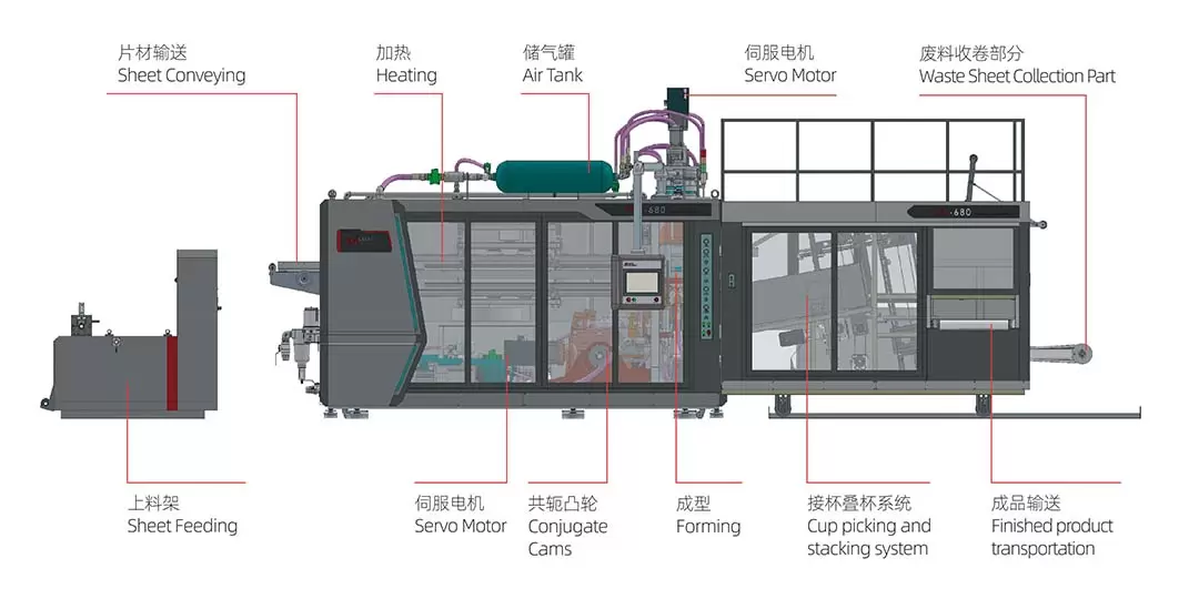 Máy ép nhiệt nghiêng cốc nhựa TFC-680 là sản phẩm mới nhất do công ty chúng tôi phát triển, chủ yếu dùng để sản xuất các sản phẩm cốc nhựa có thông số kỹ thuật khác nhau. Máy sử dụng khuôn ép áp suất dương và áp suất âm, được trang bị hệ thống đảo khuôn dưới sự điều khiển của động cơ servo hoàn toàn, sử dụng hai cặp thanh truyền động cam liên hợp để hoàn thiện việc nghiêng, nâng và đục lỗ của bàn khuôn. Đây là loại thiết bị mới được phát triển để đáp ứng các yêu cầu về năng suất cao, tiêu thụ năng lượng thấp, độ ổn định cao, tự động hóa cao và các yêu cầu khác, cung cấp giải pháp hoàn hảo cho cốc nhựa dùng một lần có công suất trung bình và cao.